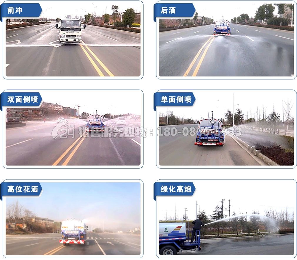 灑水車具有沖洗路面,澆灌園林,工地除塵,運水、排水,應急消防等功能。其標配為前沖、后灑和側噴,采用自吸式專用水泵,泵可抽水排水,帶消防接頭、自流閥、罐體后帶工作平臺,安裝綠化灑水炮,炮可旋轉可調節(jié)水量大小(噴射呈柱、霧、毛毛雨)。?可加裝30米到60米霧炮,加裝護欄清洗刷,除雪鏟,自動電子水炮,打藥機,保溫裝置等。