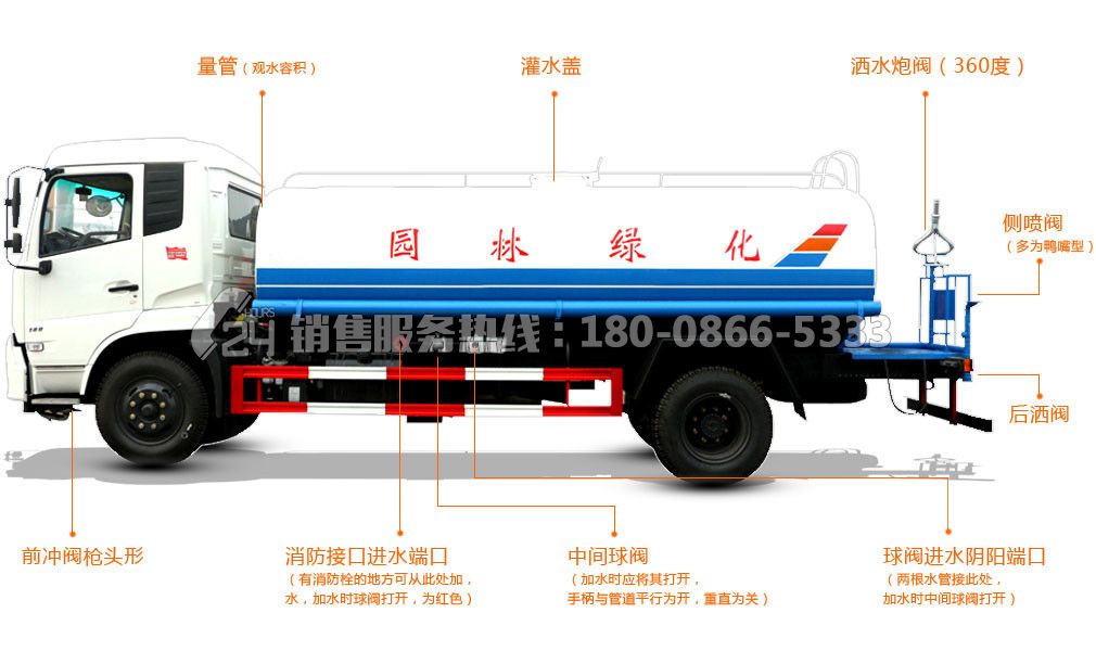 灑水車具有沖洗路面,澆灌園林,工地除塵,運水、排水,應急消防等功能。其標配為前沖、后灑和側噴,采用自吸式專用水泵,泵可抽水排水,帶消防接頭、自流閥、罐體后帶工作平臺,安裝綠化灑水炮,炮可旋轉可調節(jié)水量大小(噴射呈柱、霧、毛毛雨)。?可加裝30米到60米霧炮,加裝護欄清洗刷,除雪鏟,自動電子水炮,打藥機,保溫裝置等。