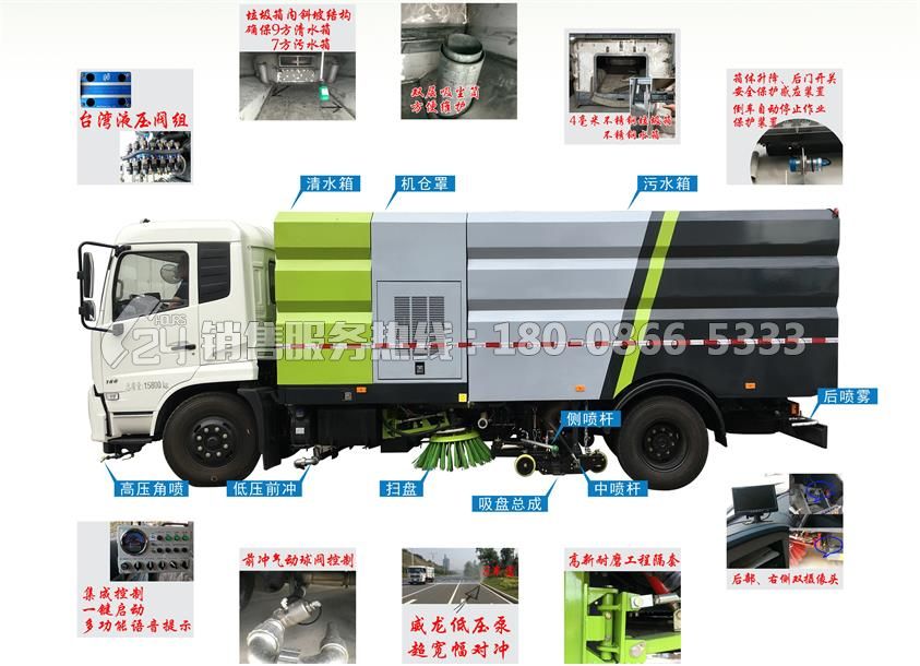 帶2個中置掃盤,江鈴64KW增壓副發(fā)動機;大力馬達;臺灣液壓閥組;威龍低壓泵(前沖);3mm不銹鋼垃圾箱;3mm不銹鋼水箱;不銹鋼高壓管路;雙層不銹鋼吸塵筒;德國控制器;美國傳感器;尾部箭頭燈;機油、垃圾箱、水箱均帶防溢或低位報警裝置;倒車及洗掃狀態(tài)室內(nèi)監(jiān)視器;倒車防撞自動保護裝置;檢修安全保護裝置;掃刷臂轉(zhuǎn)動機構使用高新耐磨工程隔套,免打黃油;20m高壓沖洗卷盤。集成式運動控制器,一鍵電腦控制。