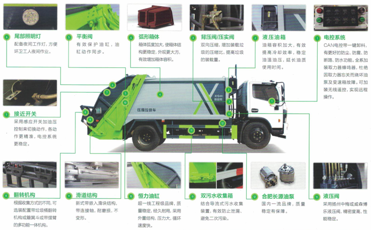 東風(fēng)多利卡D6后裝壓縮式垃圾車,由廂體、裝料機構(gòu)、壓縮機構(gòu)、卸料機構(gòu)、油泵、油缸、控制閥等組成的液壓機構(gòu)組成。廂體材料為優(yōu)質(zhì)碳鋼,厚度(單位:mm):邊4底4,廂體容積:6m3 ,裝料機構(gòu)由支架,連桿機構(gòu),凸輪,掛鉤等組成。在油缸作用下,將垃圾桶內(nèi)的垃圾自動翻轉(zhuǎn)倒入料斗內(nèi)。
