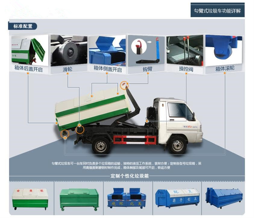 • 鉤臂垃圾車采用全液壓控制操作系統(tǒng),垃圾廂與底盤可徹底分離,具有結(jié)構(gòu)合理,操作簡便、穩(wěn)定、使用效率高、密封性能好、傾倒方便等優(yōu)點(diǎn),能實(shí)現(xiàn)一臺車與多個垃圾廂聯(lián)合作業(yè),循環(huán)運(yùn)輸,充分提高車輛的運(yùn)輸能力??梢卉噹Ф嘞?,高效、節(jié)能、節(jié)約成本。