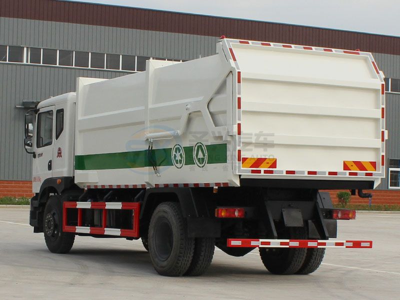 4.壓縮垃圾站在將垃圾壓縮成塊后將垃圾箱體垂直舉起,并打開壓縮箱排泄門,這時(shí)垃圾車箱體后門向上旋轉(zhuǎn)開啟,垃圾車后門與壓縮箱后門對(duì)接,之后垃圾塊被壓縮箱內(nèi)的推板水平推進(jìn)到垃圾車箱體內(nèi),完成垃圾裝載后關(guān)閉垃圾車后門,將垃圾運(yùn)到垃圾處理地進(jìn)行傾卸。