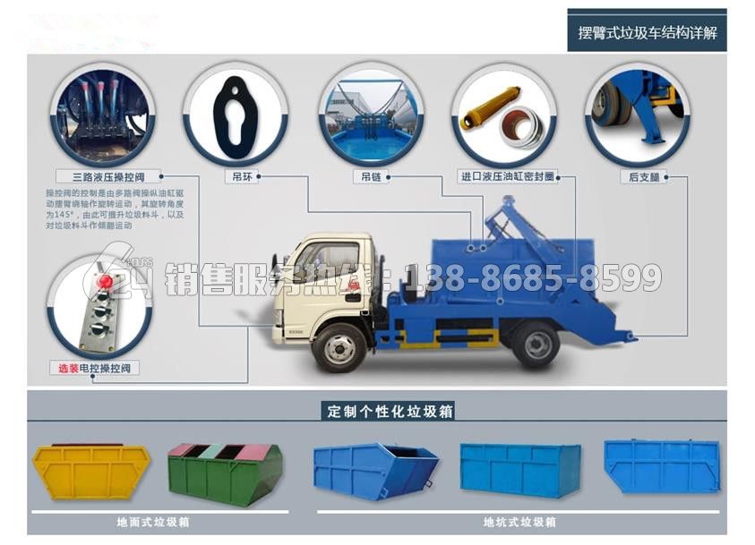 擺臂式垃圾車的特點是垃圾箱與車體分開,實現一車與多個垃圾箱的聯合使用,循環(huán)運輸。貨斗有方形和船形,方形用于地坑式,船形置于地面,充分提高了車輛的運輸能力,特別適用于短途運輸,如環(huán)衛(wèi)部門對城鎮(zhèn)垃圾的清理、運輸等。為了不使裝載的輕飄貨物在運輸中飄落,此車型可設計成全封閉結構。垃圾斗可吊上吊下,擺臂一次工作循環(huán)時間:60S。