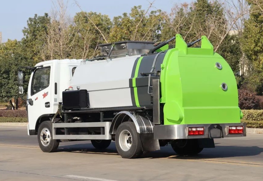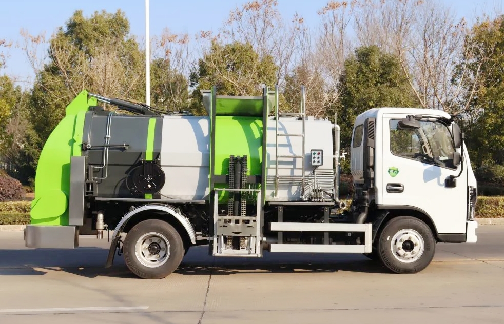 餐廚垃圾車采用方形箱體結(jié)構(gòu),箱體容積6立方。箱體采用不銹鋼材質(zhì),帶推鏟卸料功能(不帶舉升),不銹鋼干濕分離過濾網(wǎng),液壓開啟/關(guān)閉后蓋,后蓋帶密封條、液壓鎖緊;雙鏈條式提升機,可掛國標120/240L標準塑料垃圾桶;駕駛室內(nèi)集中電控(提升機外部手動控制),可加裝高壓清洗功能(液壓馬達,清洗泵,自動回位卷盤,高壓清洗水槍)帶夜間作業(yè)照明燈。