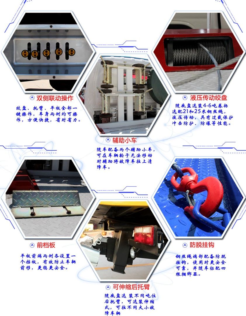 江鈴凱銳平板道路清障車,該車平板長度5.6米,寬2.33米,平板可采用4個厚花紋板或一次性成型壓制板。4噸上裝,配4噸液壓絞盤,25米鋼絲繩,雙側聯(lián)動操作,配輔助輪小車一對,7字叉一對,隨車工具一套,綁帶4套,工作燈兩個,配黃色LED長排電子警燈。我公司清障車采用國外先進嫻熟產(chǎn)品技術、生產(chǎn)工藝,全進口密封件液壓件,新型防滑板,加強型橫梁固定,增強了承載能力,且平臺裝載面采用模具沖壓,耐力強不變形,全國設有售后服務站點,并保證全國均可上牌。