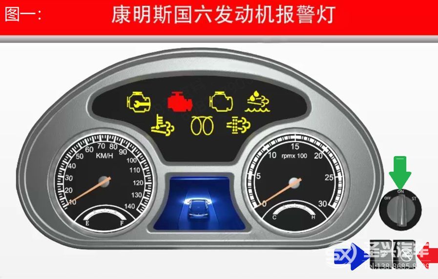 1)DPF 再生指示燈 黃色+閃爍:駐車再生提醒,需要到安全位置進(jìn)行駐車再生;圖一右下角藍(lán)色箭頭所指的是駐車原地強(qiáng)制再生開關(guān)。