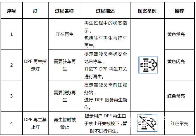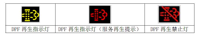 DPF 燈包含 DPF 再生指示燈和 DPF 再生禁止燈,燈的顯示形式主要為黃色閃爍、常亮和紅色。