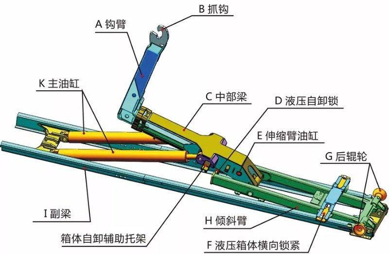 拉臂鉤拉臂鉤主要由 A 鉤臂 B 抓鉤 C 中部梁 D 液壓自卸鎖 E 伸縮臂油缸 F 液壓,箱體橫向鎖 G 后輥輪 H 傾斜臂 I 副梁 J 箱體自卸輔助托架 K 主油缸結構組成。