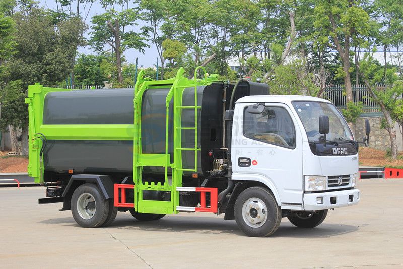 (圖為東風多利卡壓縮式掛桶垃圾車---垃圾車價格致電 158 9762 6104)