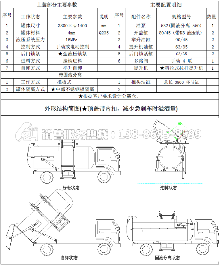 上裝配置:罐體采用優(yōu)質(zhì)碳鋼板材,罐體內(nèi)部帶固液分離功能(全推推板,不銹鋼泔水分離網(wǎng)板),罐內(nèi)加熱功能(用于嚴(yán)寒地帶防止罐內(nèi)餐飲垃圾凍結(jié)凝固,采用柴油燃燒機(jī)加熱,加熱速度快效果好,可設(shè)置高低溫實(shí)現(xiàn)自動(dòng)溫控)全液壓操作系統(tǒng),工作人員操作方便,罐體舉升自卸,拉桿式掛桶提升機(jī),可以掛120/240升垃圾桶進(jìn)行作業(yè),后蓋液壓驅(qū)動(dòng)開(kāi)啟、鎖緊,方便人員操作。