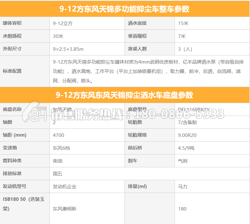 9-12方東風天錦多功能抑塵車整車參數(shù)配置:
