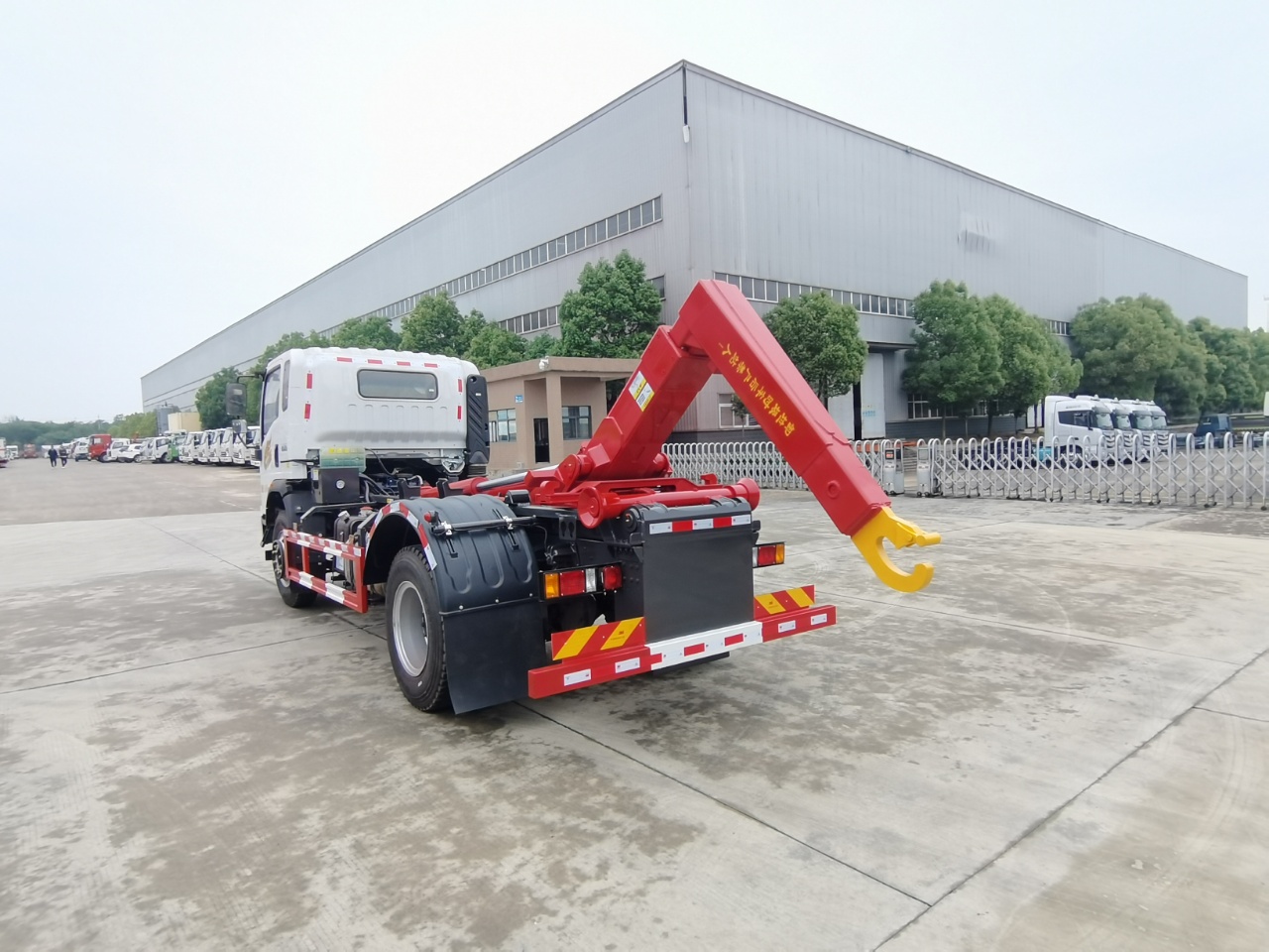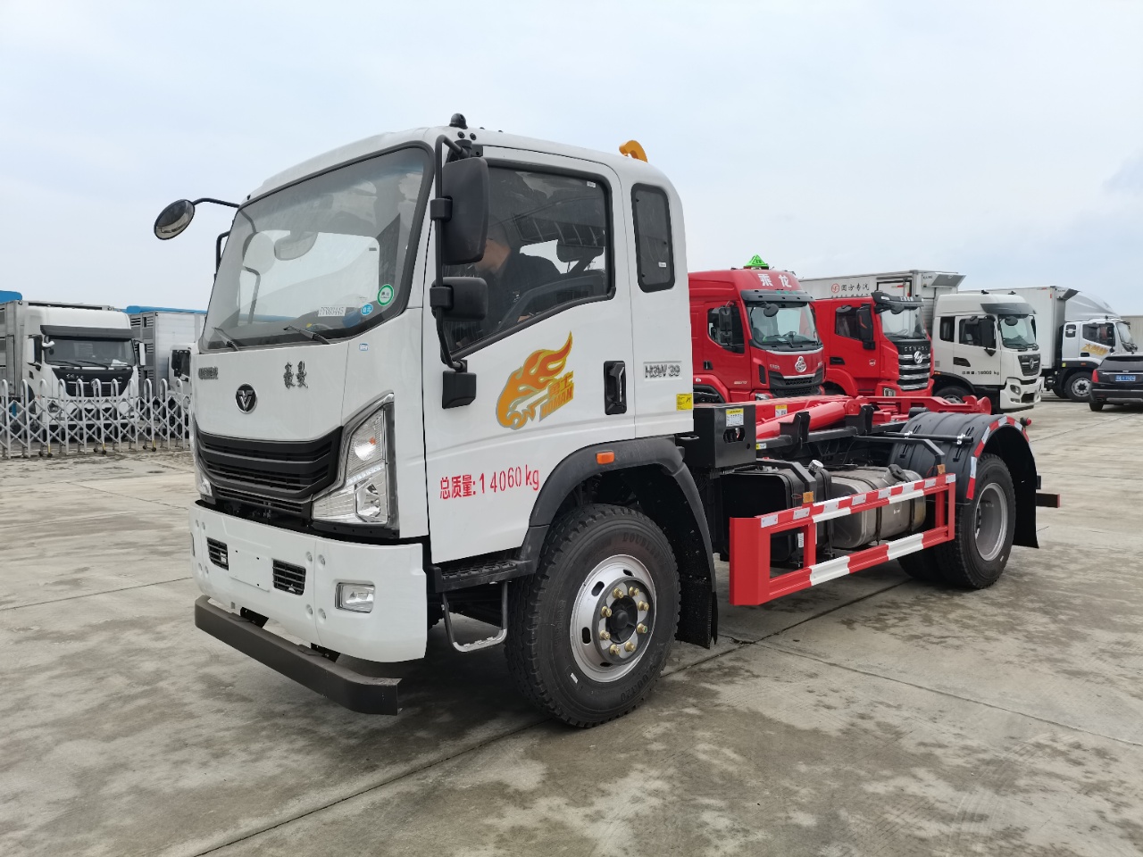 重汽豪曼黃牌鉤臂式垃圾車,采用濰柴190馬力發(fā)動機、法士特8檔變速箱、3900軸距、雙層大梁、9.00鋼絲胎、10噸153后橋,空調(diào),ABS。