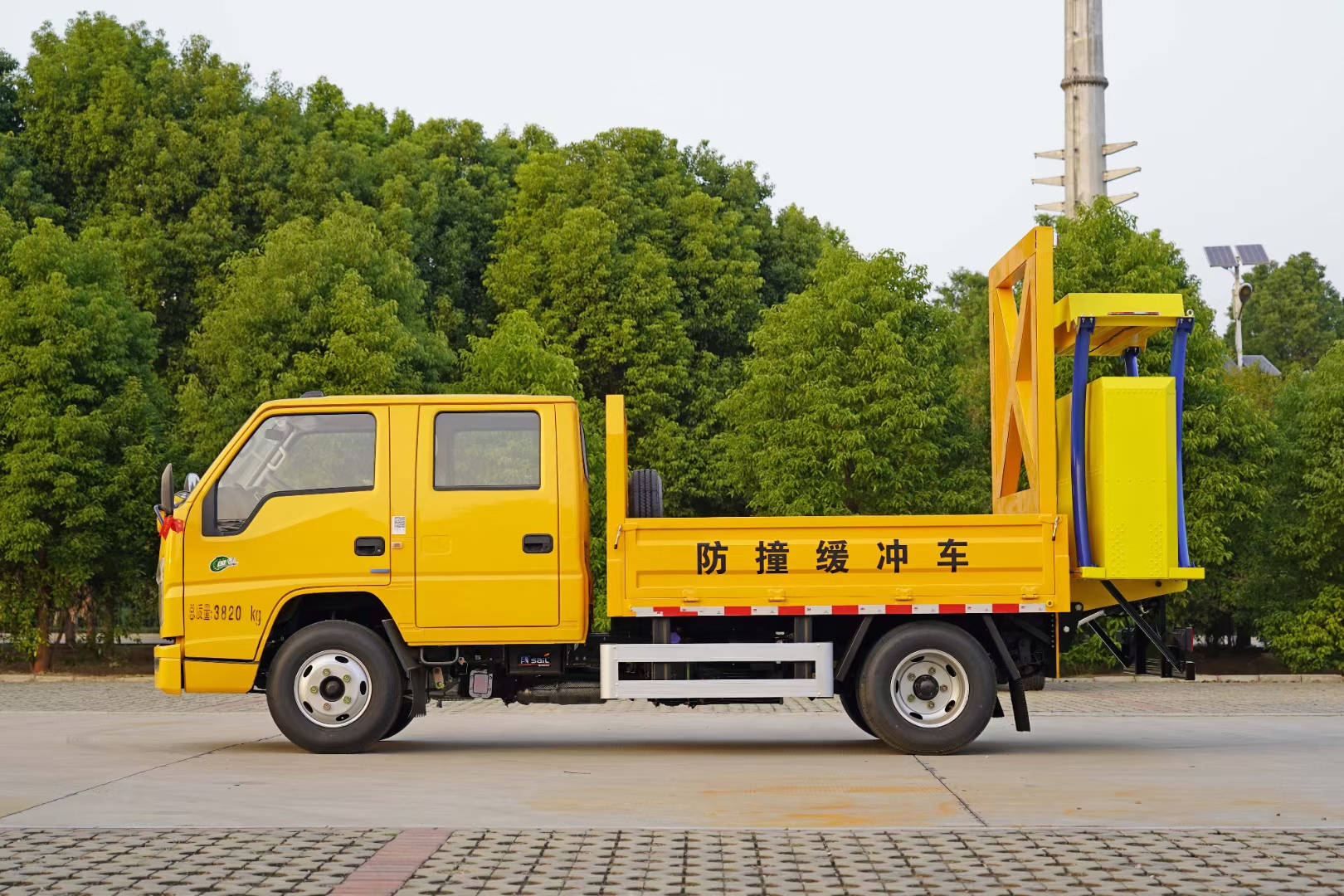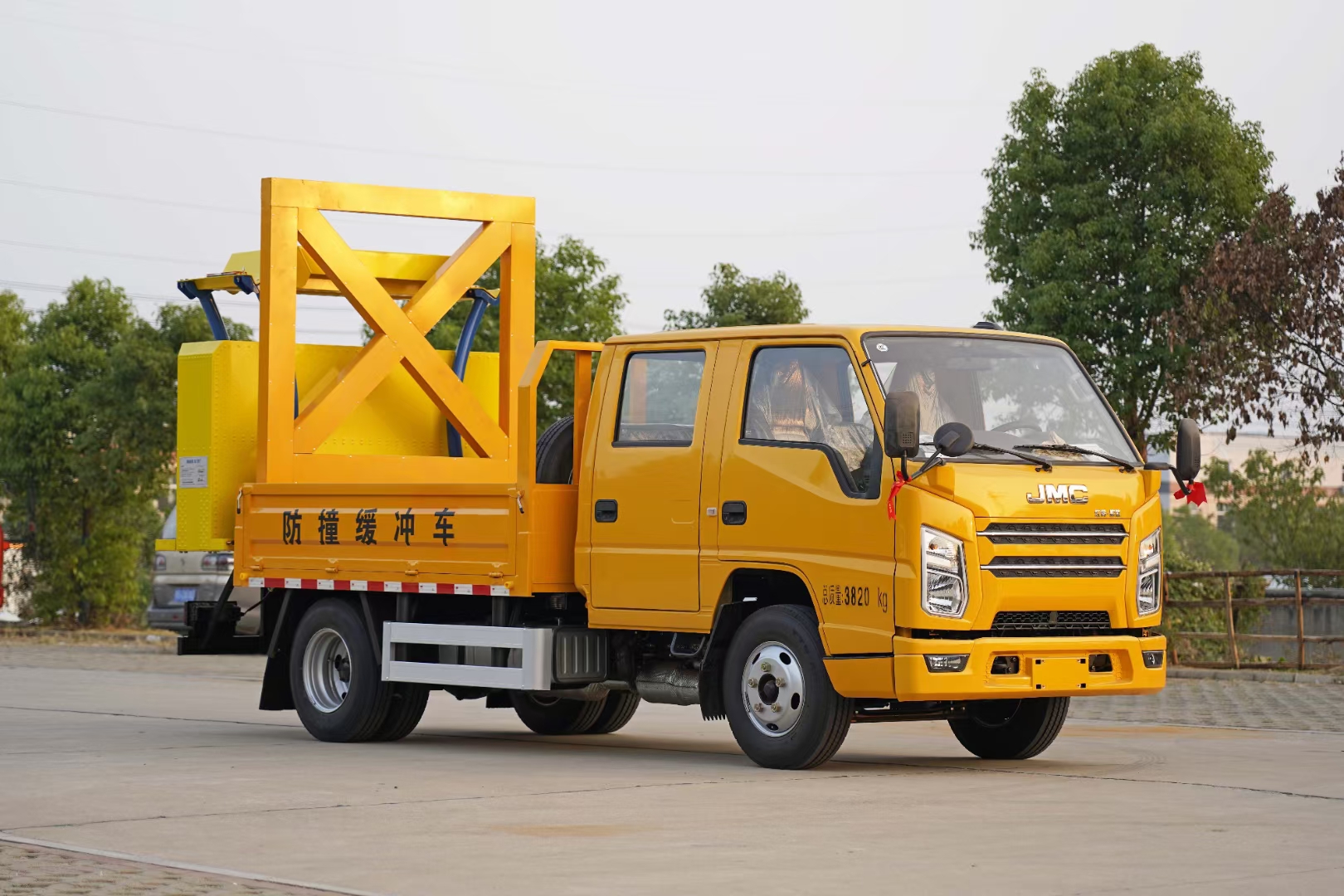 上裝采用Q235國標(biāo)邊3mm底板花紋板4mm厚,箱體后部防撞緩沖模塊包采用國際知名技術(shù)產(chǎn)品70K防撞緩沖模塊,防撞緩沖吸能模塊主要由車載防撞緩沖墊和導(dǎo)向標(biāo)志架組成,可充當(dāng)施工作業(yè)車輛后方的緩沖衛(wèi)士。