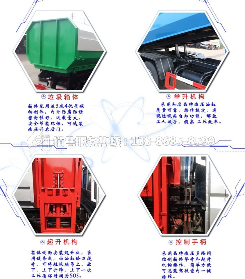 時風(fēng)3方自裝卸式垃圾車,箱體采用優(yōu)質(zhì)容積板制作,邊板厚度2mm,底板厚度3mm,掛桶提升機置于副架一側(cè),采用液壓驅(qū)動,提升機類型需根據(jù)客戶實際用車需求進(jìn)行確定,液壓閥采用國內(nèi)知名品牌,穩(wěn)定性好,液壓傳動效率高,垃圾箱支持舉升自卸,后門開閉采用手動開閉,結(jié)構(gòu)簡單,經(jīng)久耐用。