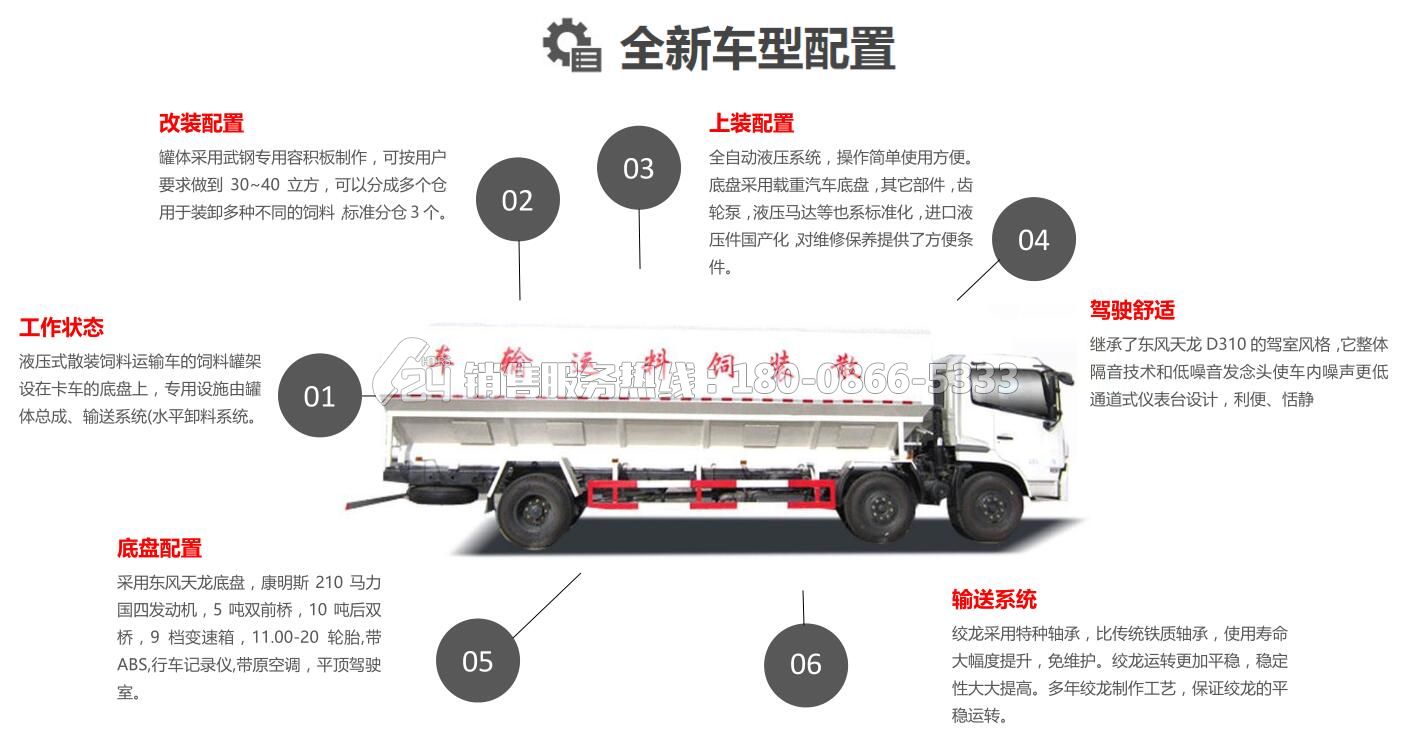東風天錦散裝飼料車,東風天錦單排駕駛室,康明斯180馬力或210馬力,法士特8檔變速箱,5000mm軸距,10.00R20鋼絲胎,電動門窗,中控鎖,ABS,方向助力,原裝空調